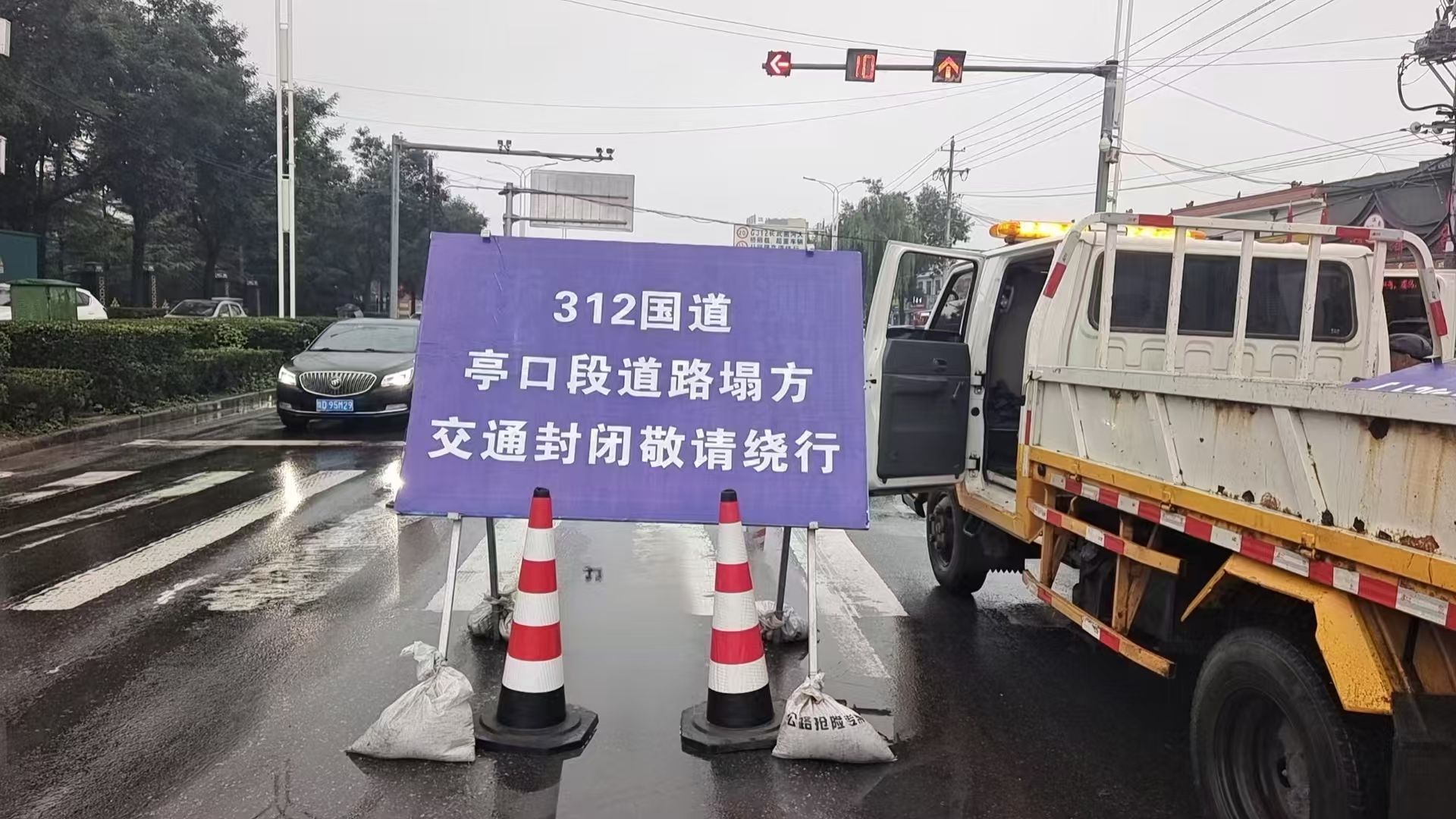 受连日持续降雨影响,10月6日上午10时许,312国道K1696➕950处(长武亭口坡道段)道路塌陷,致双向车道阻断。由于水毁严重,该路段不具备通行能力,为保障出行安全,咸阳市公路局第一时间启动应急响应,联系公安交警部门发布道路封闭通告和绕行方案。长武管理段采用钢管引流措施进行临时处置,防止水毁进一步扩大,连夜安排专人值守现场观察水毁情况。