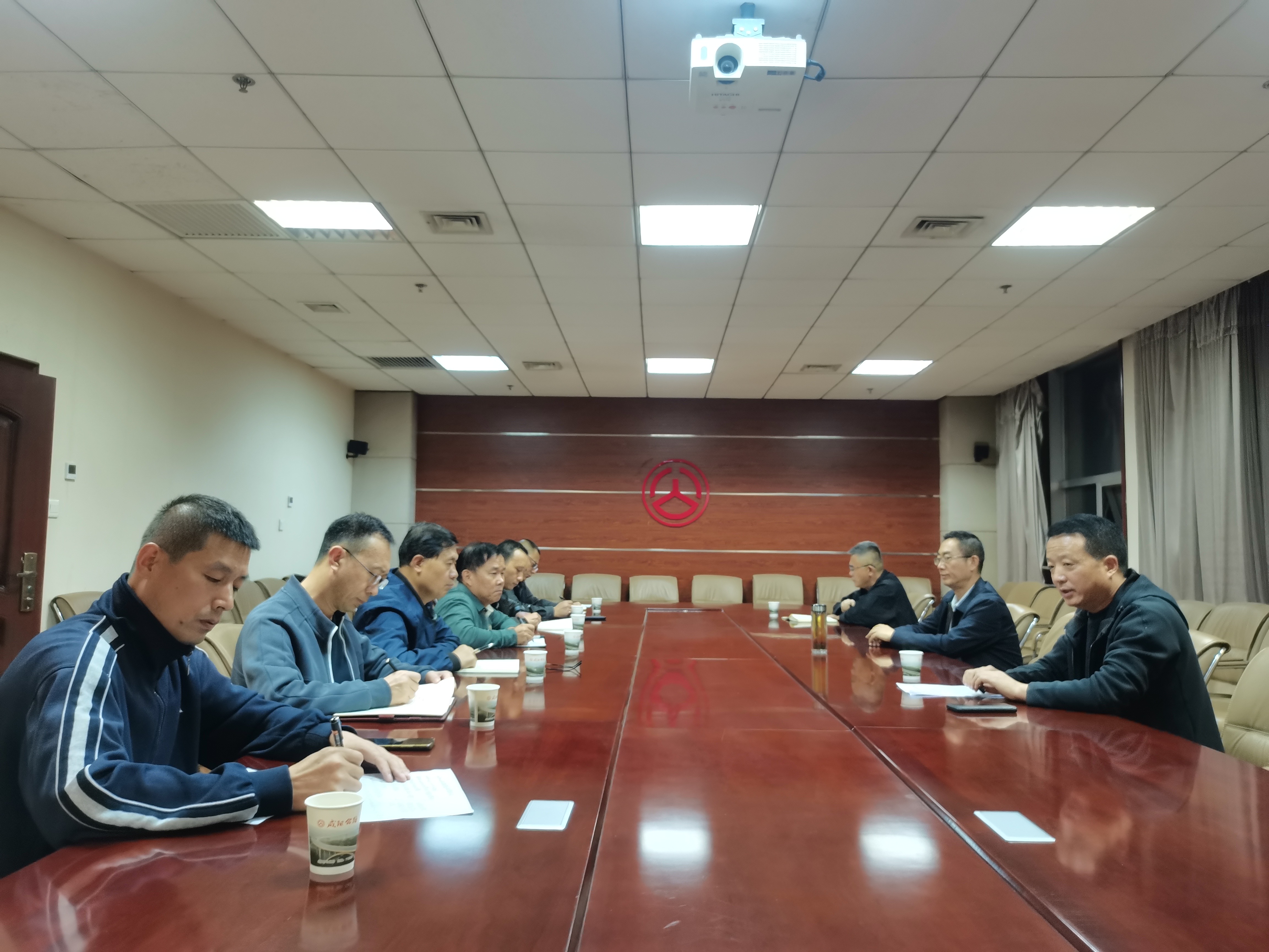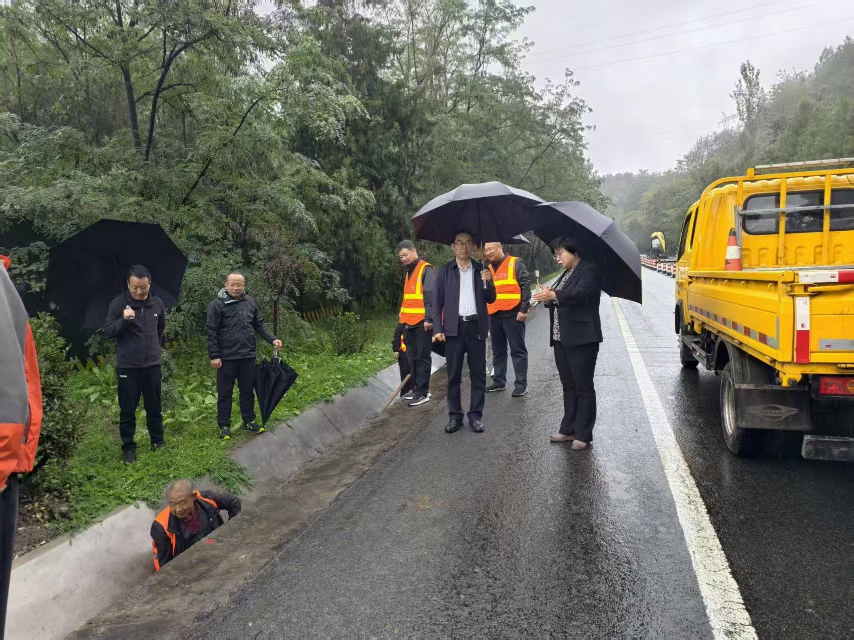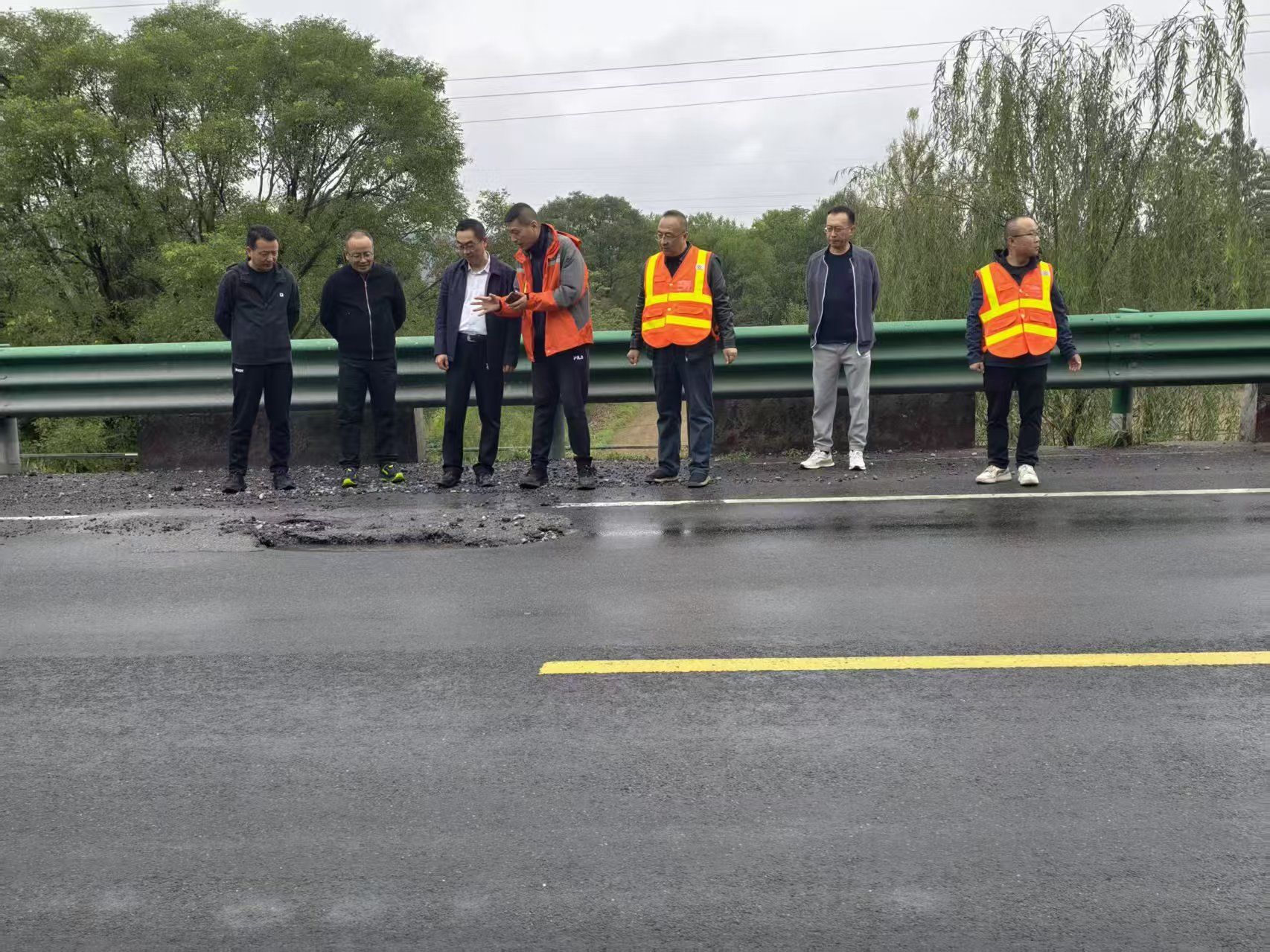 7日上午,局长文涛、总工程师卫党委即带领相关科室及设计单位赶赴现场,实地勘察水毁点位、评估受损程度,组织现场会商,初步确定“优先打通通行通道、后续完善路面修复”的工作路径。7日晚的推进会围绕核心工作思路,对各部门任务进行分解。一是结合设计单位意见,细化“先保通”实施方案,同步调集施工机械与人员力量,确保10月8日上午全面进驻现场,优先开展清障、临时排水、路基填筑、铺设简易路面等作业,快速恢复路段基本通行能力,后续按计划开展路面结构修复工作;二是紧密配合,协同当地公安交警部门划定作业区域、设置警示标识,做好交通分流疏导,既要保障施工车辆进出顺畅,也要确保施工人员安全,为“先保通”创造安全作业环境;三是各业务科室专人驻点旁站,紧盯临时设施安全性、施工流程规范性,为后续路面修复工作提前明确质量标准,实现保通与修复的安全质量无缝衔接;依托5G网络及视频会议系统,搭建指挥中心与施工现场“实时连线通道”,动态传递保通进度、反馈现场问题,保障会商调度高效顺畅,助力各环节工作快速推进;聚焦抢通实时跟进报道,第一时间向社会发布施工进度、道路通行状态、临时绕行路线等信息,及时回应群众关切,引导公众合理安排出行。