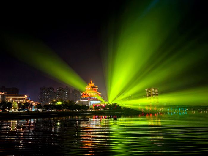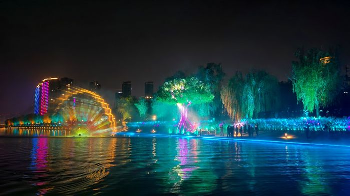 2、10月1日—2日每天20:00-20:10,在统一广场游船码头进行双人水上火壶表演,届时,将有数千架无人机在空中进行各种姿态变换,展示咸阳文化特色,营造“天空之门”效果。