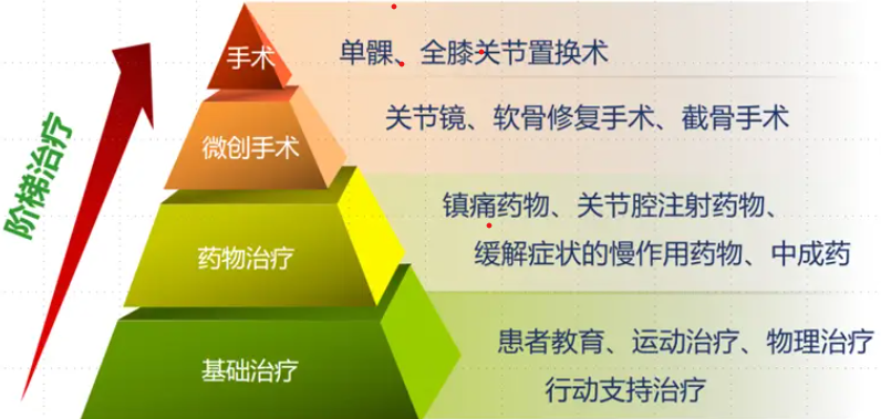 骨关节炎的治疗并非只有吃药和手术,而是遵循一个科学的“阶梯治疗” 原则。这个概念就像爬楼梯,从最简单、最基础的生活方式干预开始,如果效果不佳,再逐步升级到更复杂的治疗方案。