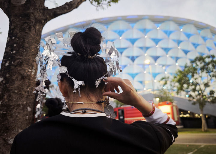 2024年11月20日,一名女子在三亚市体育中心场馆外整理头饰。新华社记者 李尕 摄