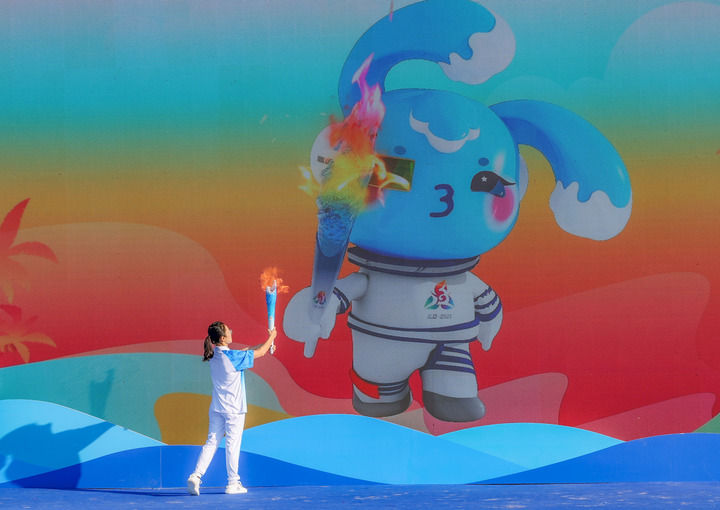 2024年11月17日,火炬手韩晓燕在三亚进行的火炬实地传递活动起跑仪式上与本届运动会吉祥物“吉贝”对接,点燃火炬。新华社记者 陈朔 摄